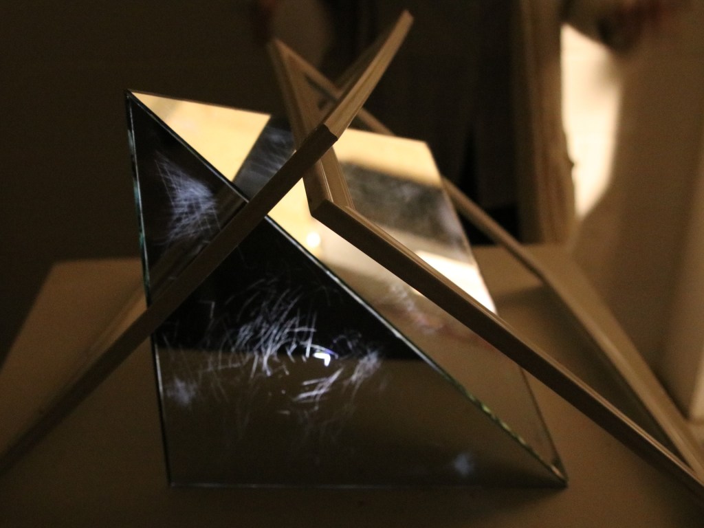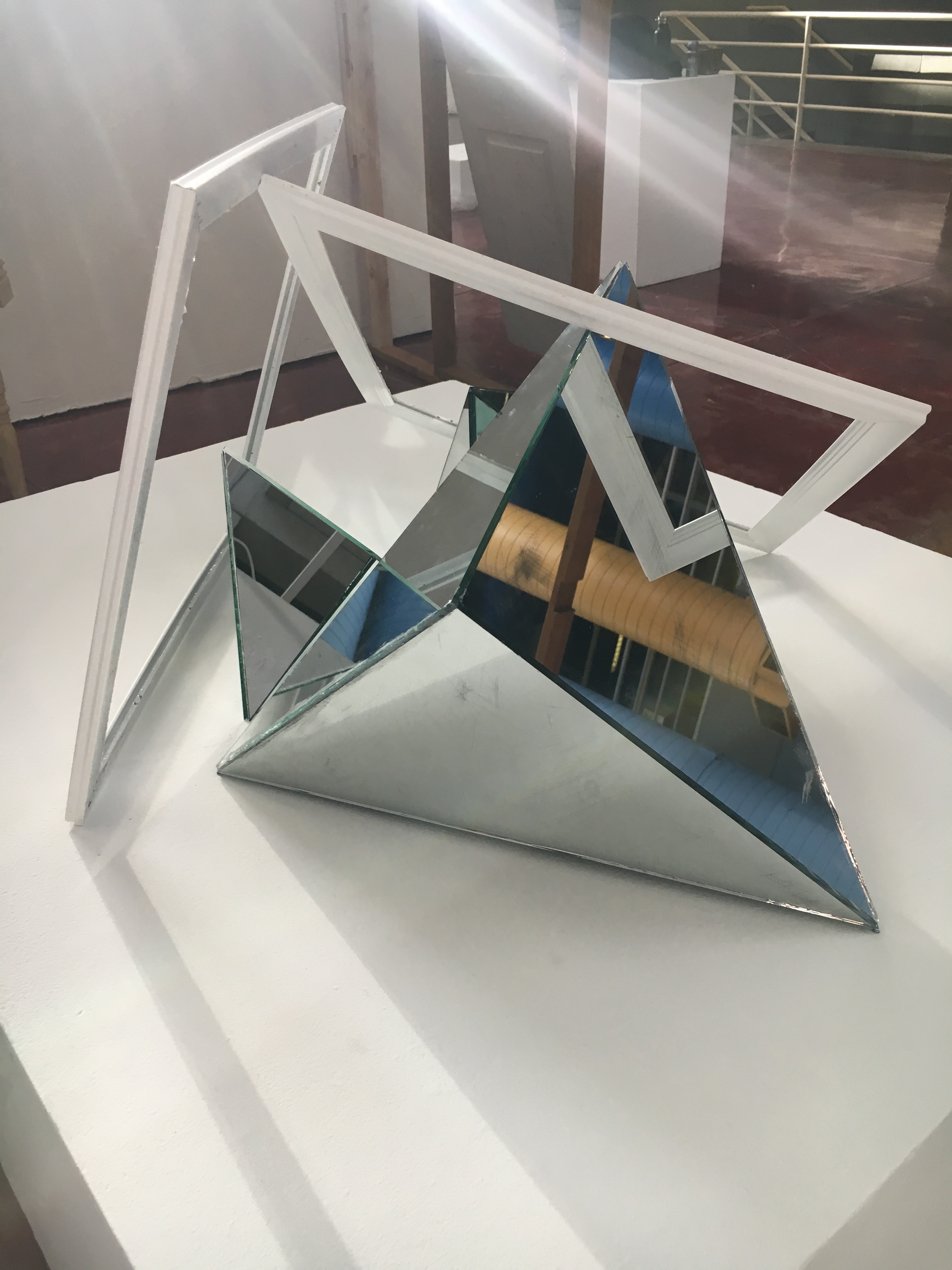 The foreign geode protrudes through the frames piercing the planes once occupied by a memory. The empty frames balance on the form as precarious reminders of their function before the intrusion.